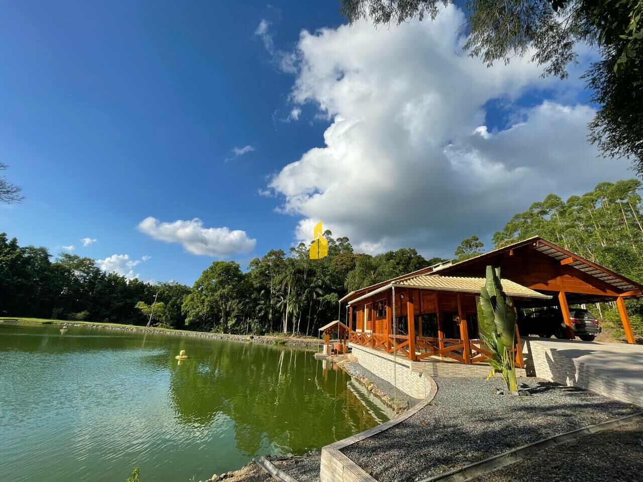 Deslumbre-se e relaxe com a família na aconchegante casa de campo, toda construída de madeira de lei, com vidros espelhados e acabamentos em porcelanato, ressaltando ainda mais o charme do local.