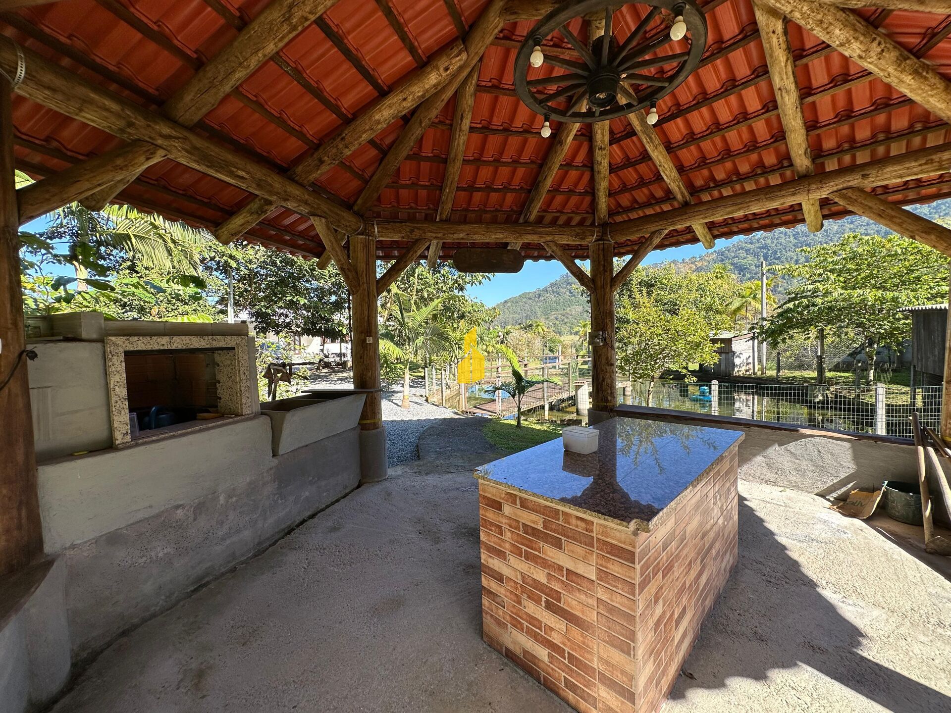 Uma cozinha com fogão a lenha, área de serviço, churrasqueira para sua comodidade e conta com portão eletrônico que garante segurança e comodidade .